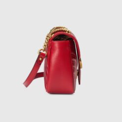 The small GG Marmont camera bag has a softly structured shape and a flap closure with Double G hardware. The sliding chain strap can be worn multiple ways, changing between a shoulder and a top handle bag. Made in matelassé chevron leather with a heart on the back.