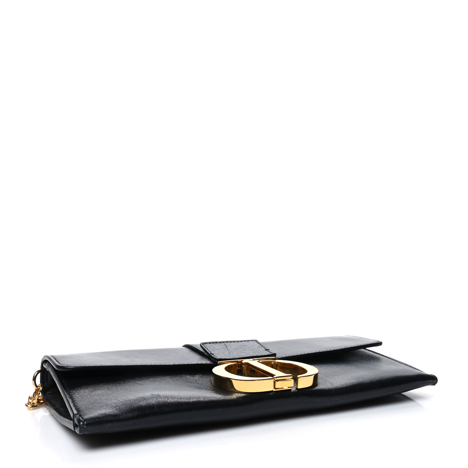 This is an authentic CHRISTIAN DIOR Calfskin 30 Montaigne Chain Pouch in Black. This flap bag is finely crafted of glazed calfskin leather in black. The bag features an optional gold chain shoulder strap. The gold push lock opens to a black leather interior with a zipper pocket.
