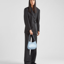 The Prada Cleo bag with sophisticated allure reinterprets an iconic design of the brand from the 1990’s. Sleek curved lines emphasized by the particular construction rounded on the bottom and sides give this hobo bag a soft, light look. Brushed leather, a modern and versatile material that is distinctive in Prada collections, is ideal for creating always new combinations and contrasts. The enamel triangle logo decorates the silhouette.
