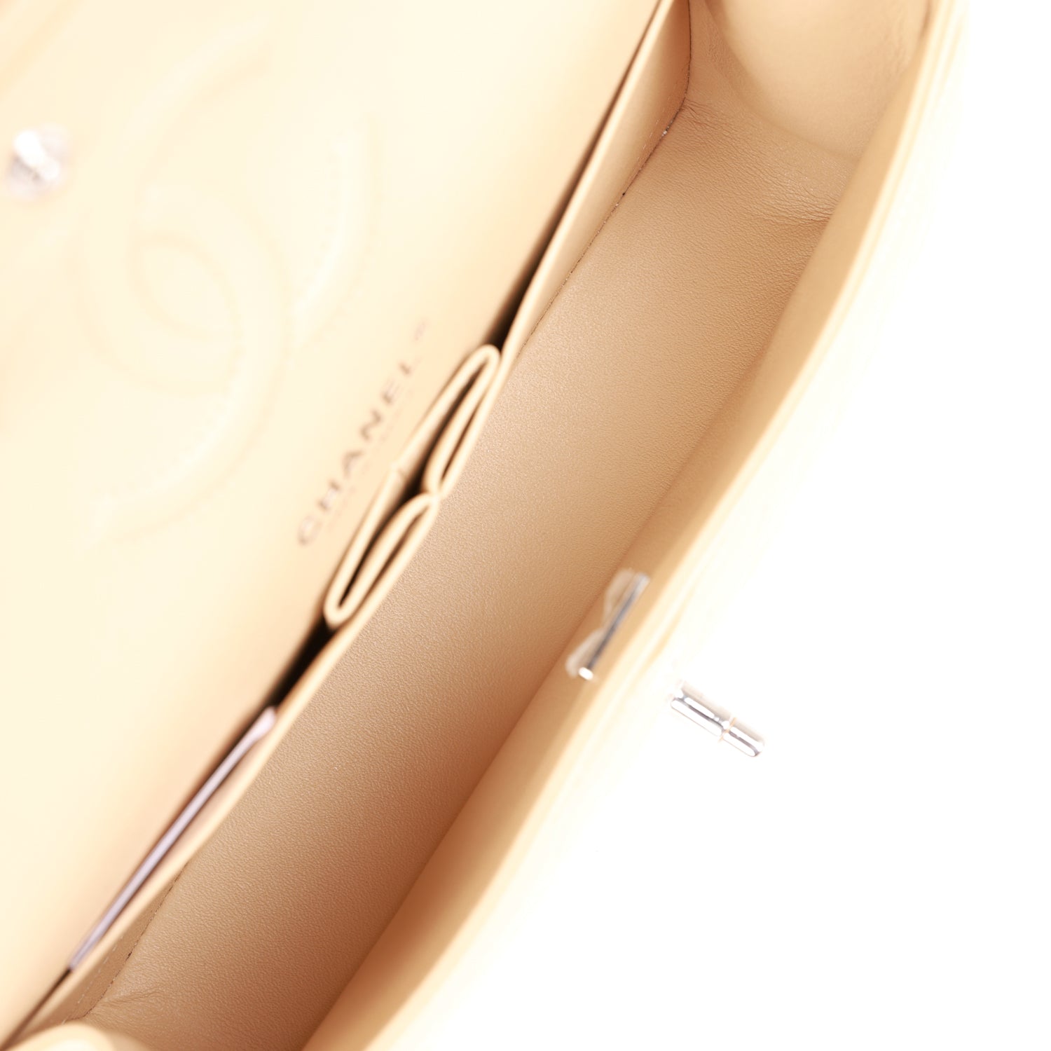 The interior is lined in beige leather with the “love letter” zipper compartment underneath the first flap, an “outer” slit pocket under the second flap, and an interior compartment with two open pockets separated by a “lipstick” compartment.