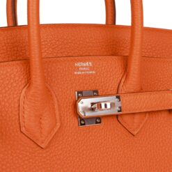 This Birkin is in Orange togo leather with palladium hardware and has tonal stitching,front flap, two straps with center toggle closure, clochette with lock and two keys, and double rolled handles.