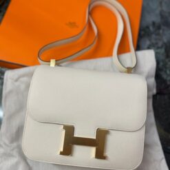This Constance is in Vert Jade epsom leather with gold hardware and has tonal stitching, a metal “H” snap lock closure and adjustable shoulder strap.