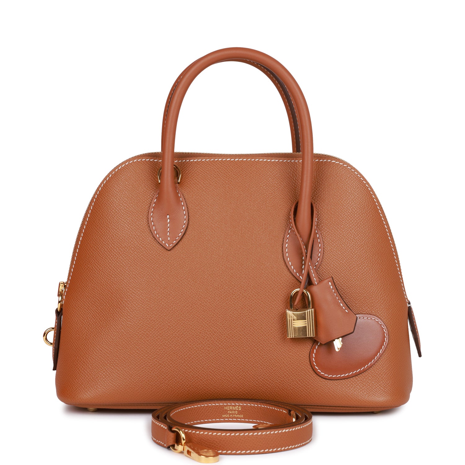 This limited edition 25cm 1923 Bolide en Desordre is in gold epsom leather with gold hardware and has contrast stitching, a top zipper closure, double rolled handles, back slip pocket, front leather patch and removable shoulder strap.