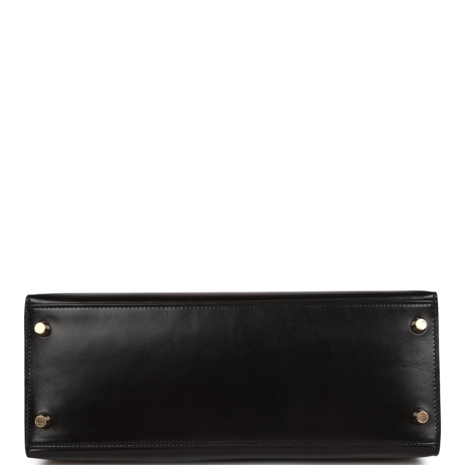 This Kelly Sellier is of black box calf leather with gold hardware and has tonal stitching, a front toggle closure, a clochette with lock and two keys, a single rolled handle and an optional shoulder strap.